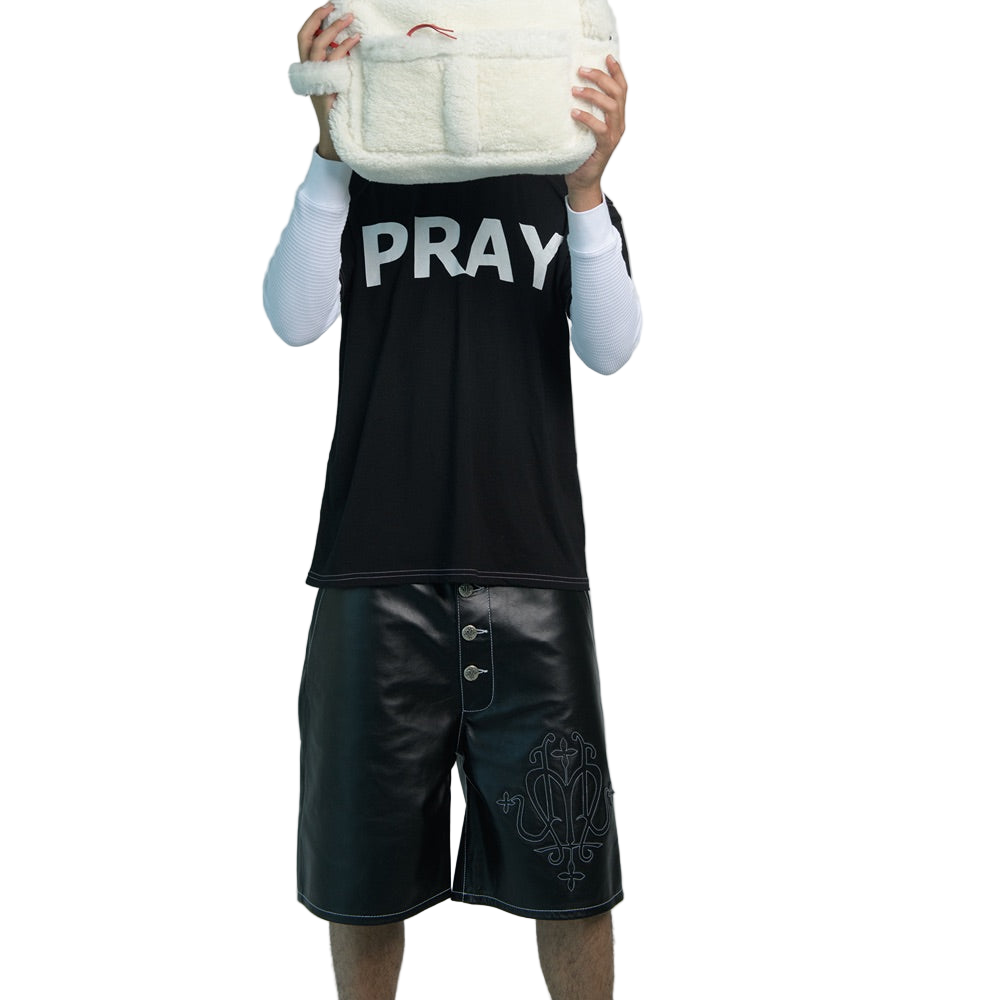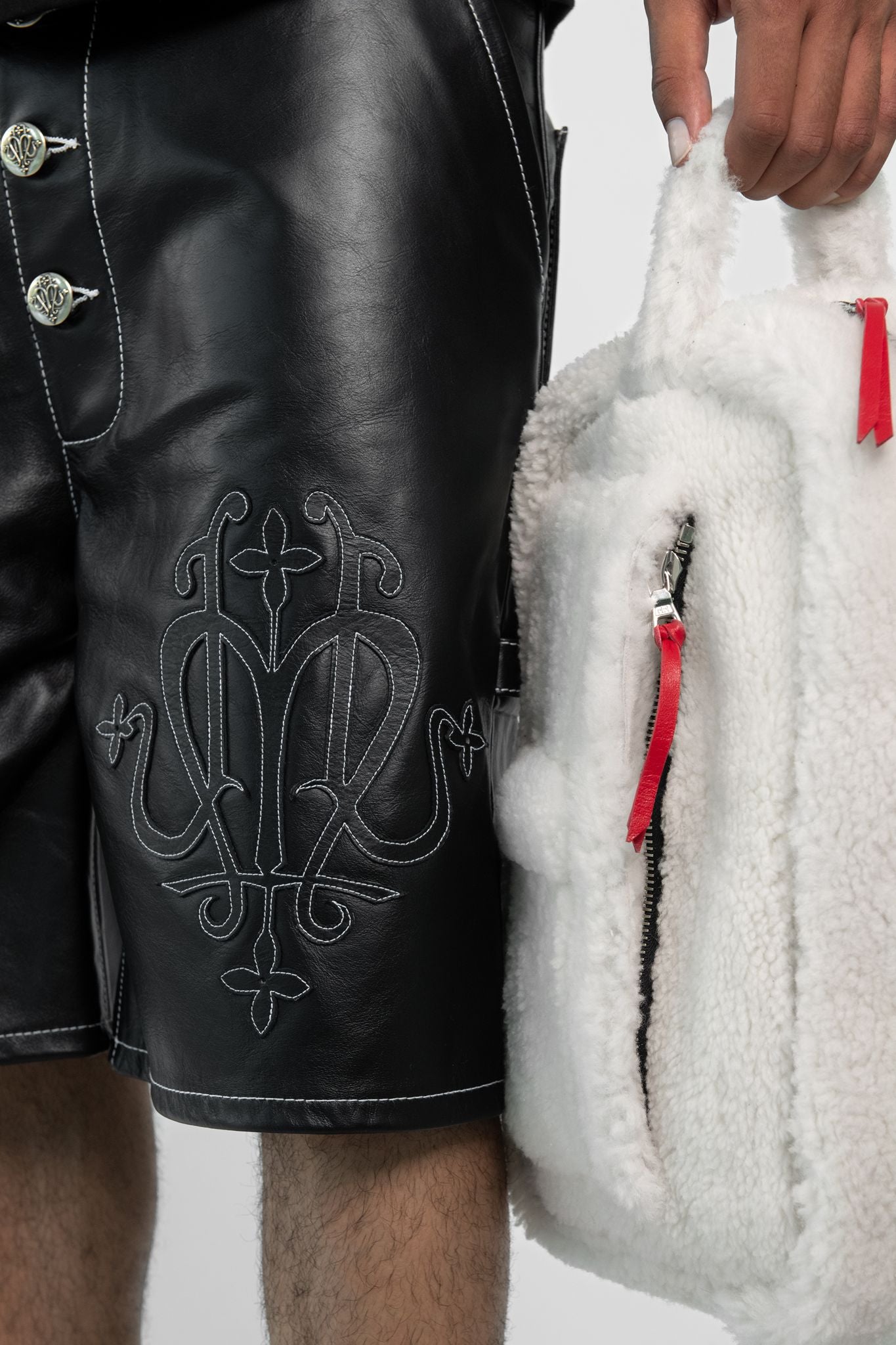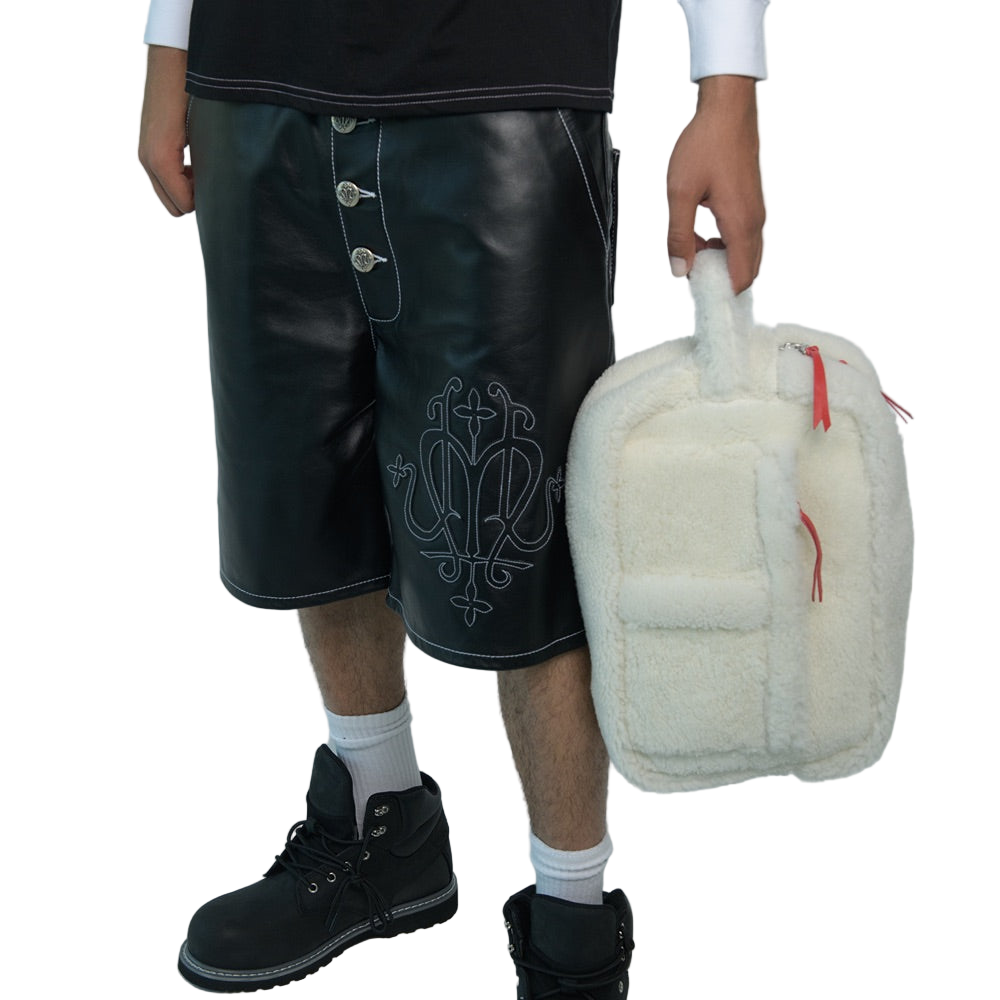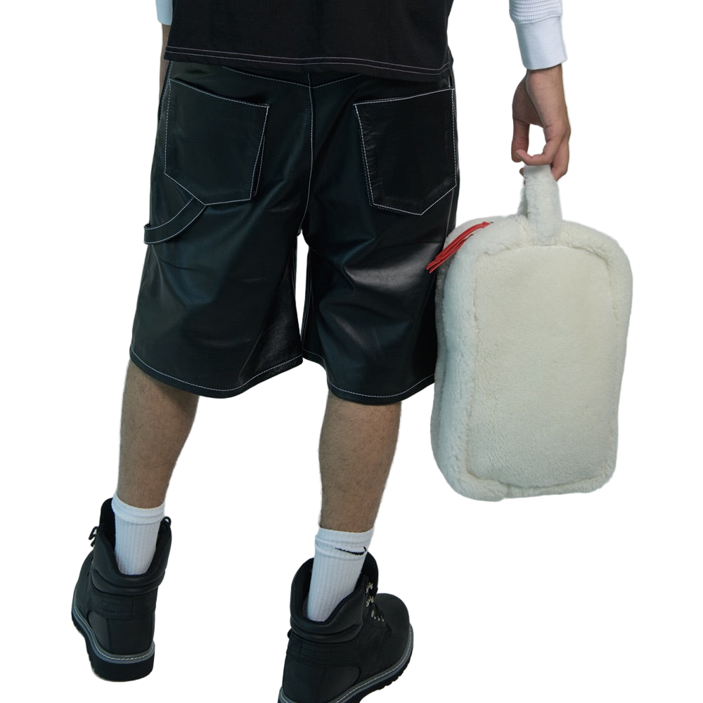 Crafted from premium heavy calf leather, these black leather shorts offer exceptional softness and durability. Designed with an oversized, loose fit, they provide comfort without sacrificing style. Four jumbo sterling silver logo buttons enhance the sophisticated appearance, while two deep front pockets, reinforced for strength, and two gusseted back pockets add practical storage. The left side features a large, hand-cut and hand-stitched logo, meticulously sewn for precision. A leather label on the back completes the refined details, making these shorts a durable and stylish choice.
